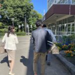 (株)大宮ホーロー北海道製作所の甚内社長を先頭に、シマエナガストラップの発案者〜デザインをされた高橋さんと月寒小学校卒業生の小竹の3名で月寒小学校に向かっています。