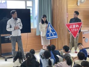 交通標識の実物を見せながら、
